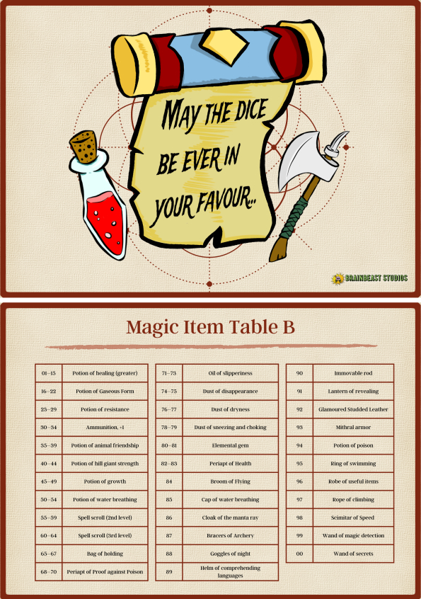 Tired of flipping through books for Item Tables during the game? Just want to have decided ahead of time which ones you want, and tuck it behind the DM Screen? Well now you can with these printable Magic Item Table cards.